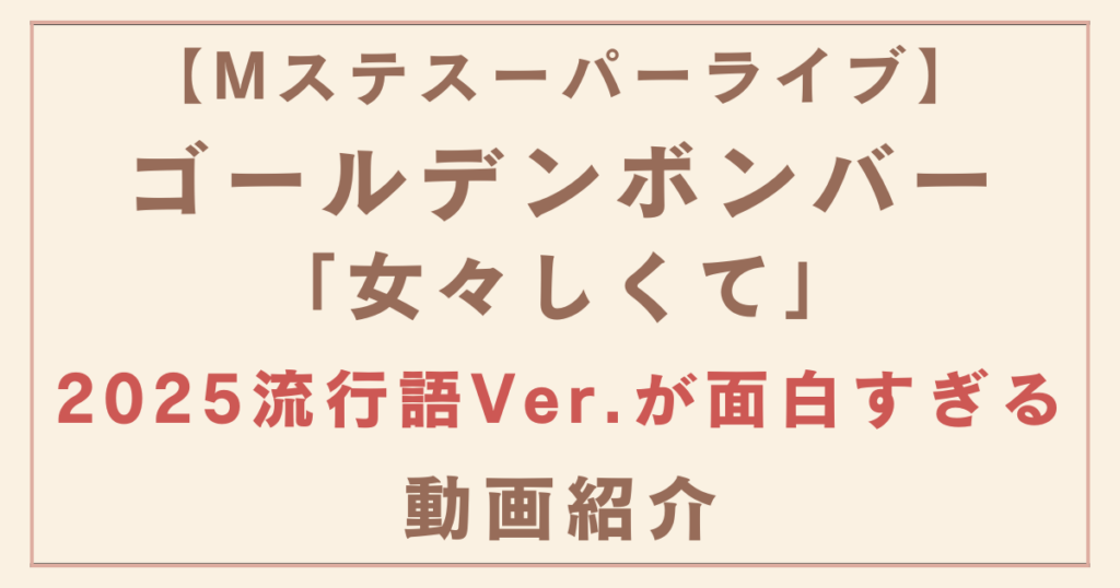 2025年12月26日に放送されたMステスーパーライブに出演したゴールデンボンバー。 大ヒット曲「女々しくて」の2025流行語バージョンを披露し、SNSでは「笑ったよ〜」「面白過ぎる」「サイコー」など 盛り上がっています。また、「Mステ用に流行語替え歌の歌... -